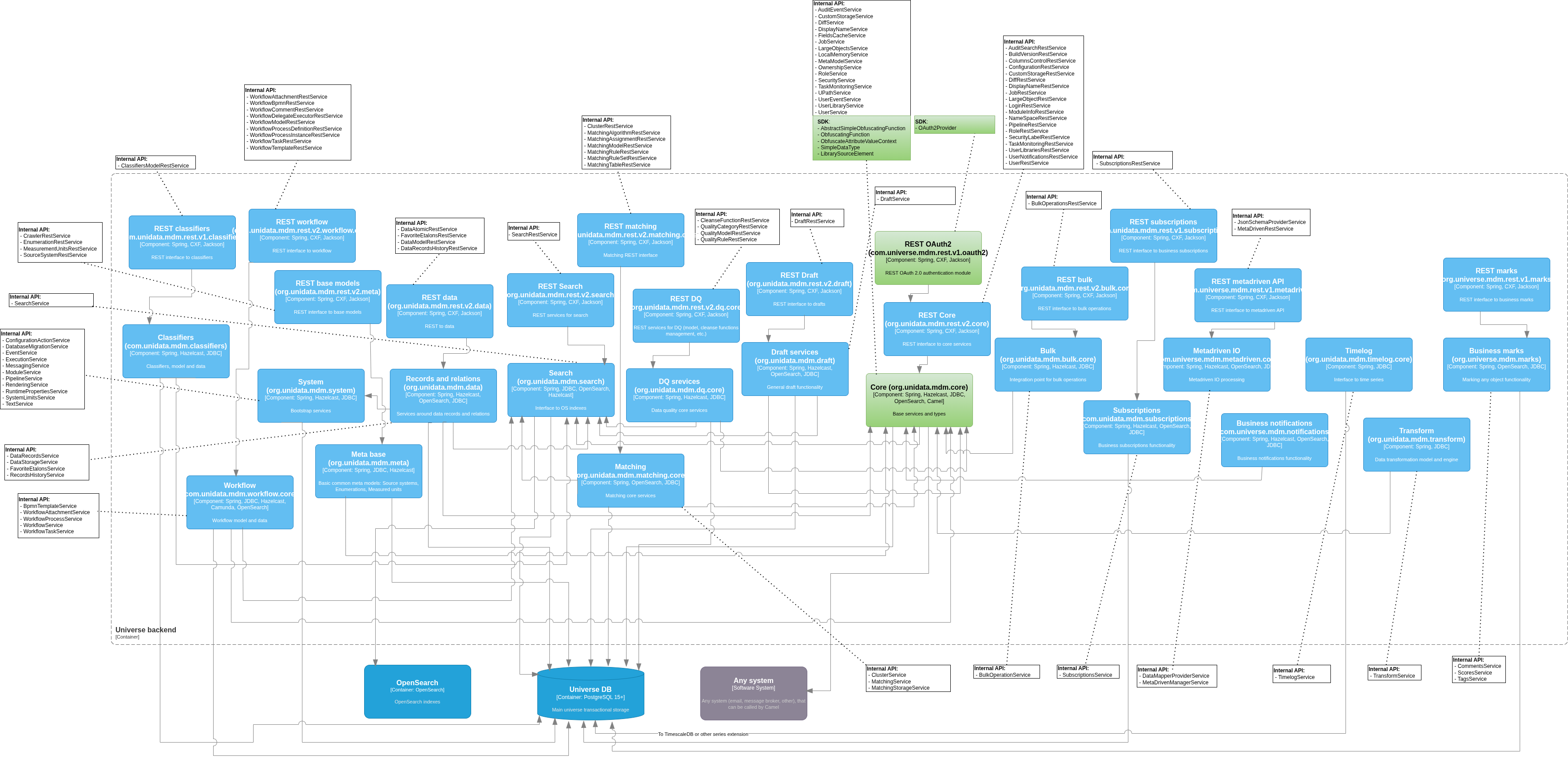 На диаграмме C3 представлен список модулей предоставляющих Internal API (Сервисы, используемые внутренними разработчиками для реализации бизнес логики продукта) и SDK (Классы и интерфейсы используемые для расширения бизнес логики сторонними разработчиками).